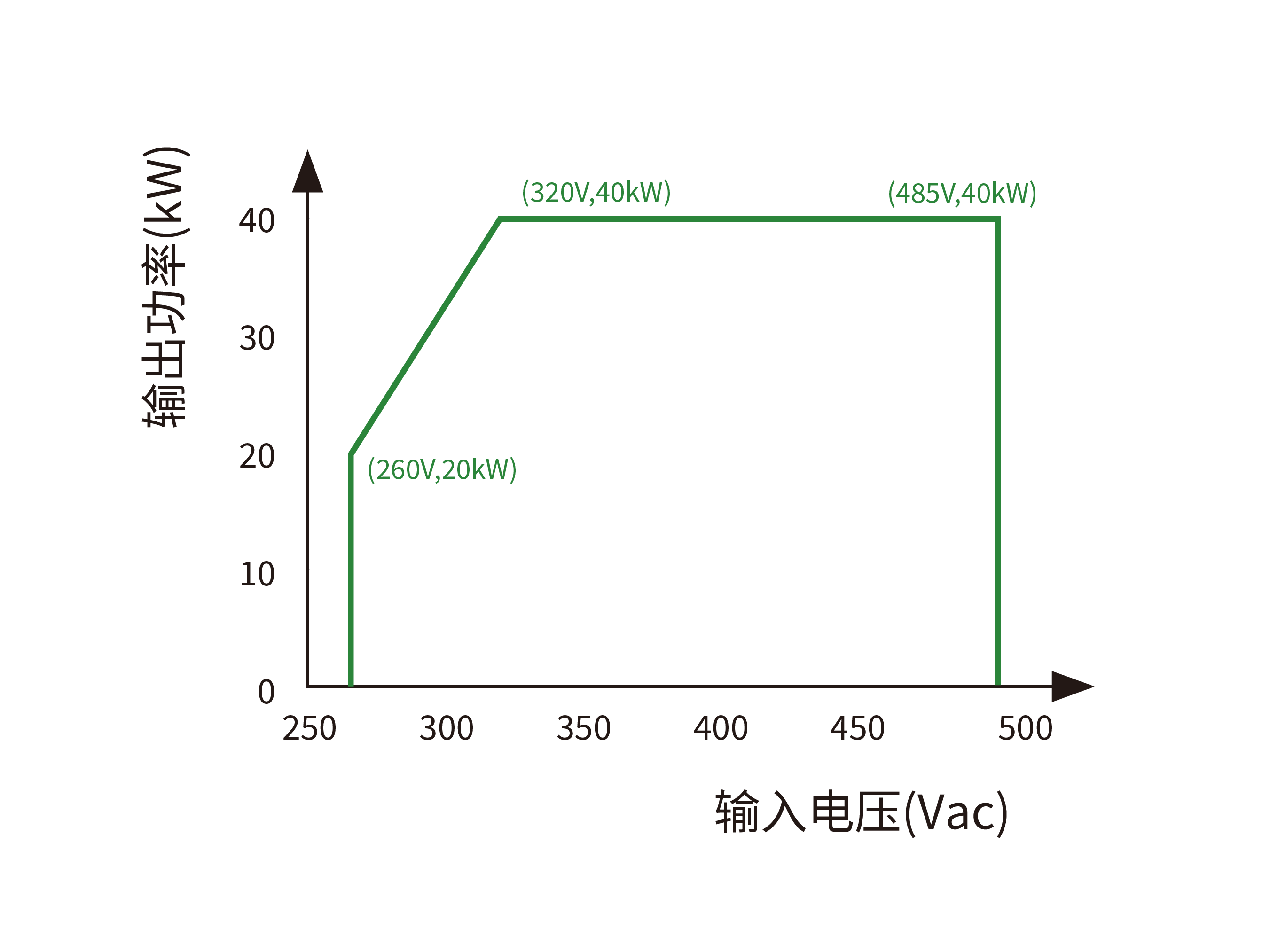 | 恒功率输出 | 40kW(300-1000V) 高低压自动切换 低压模式:300V-500V 高压模式:500V-1000V |