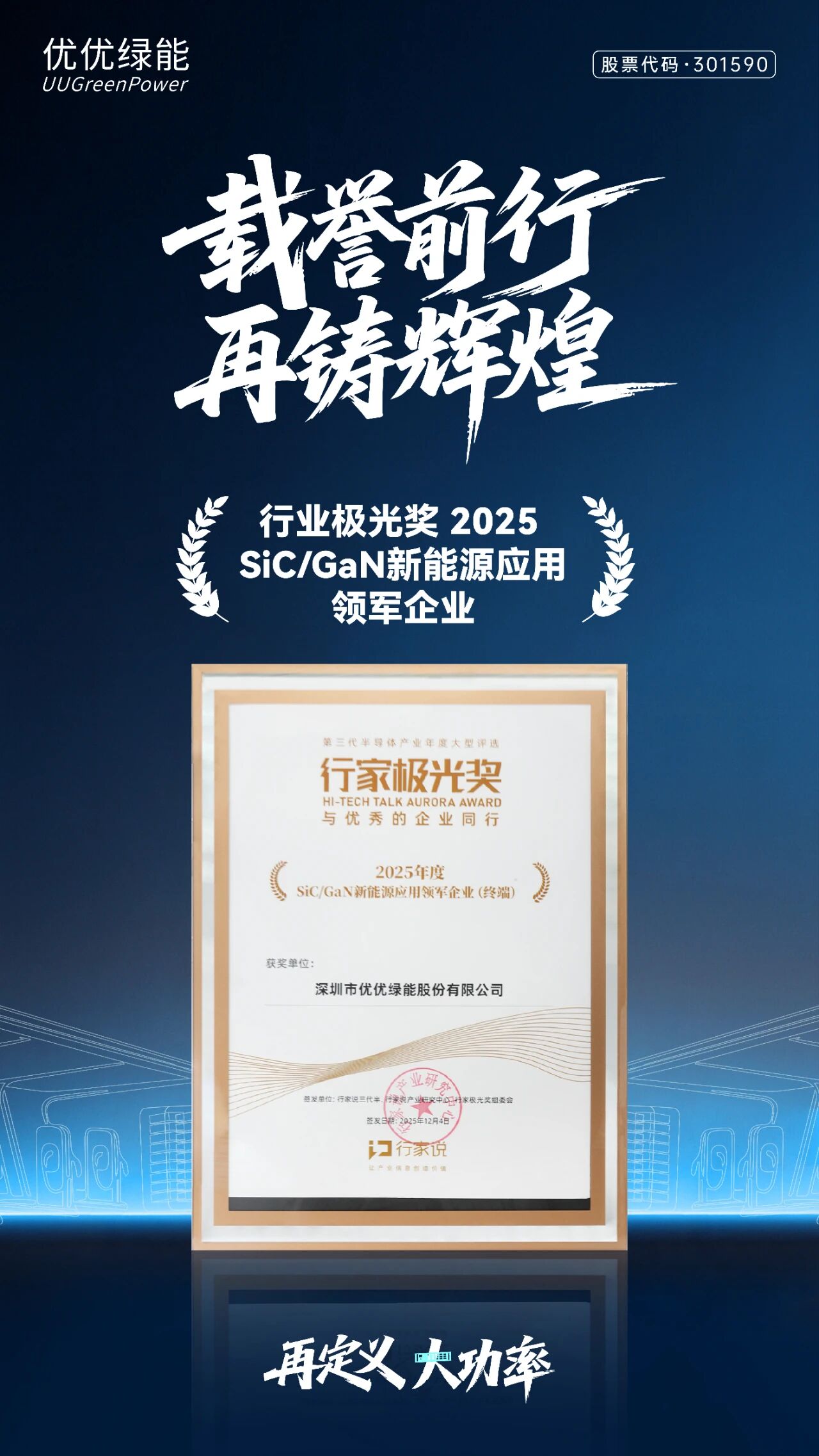 备受瞩目的“2025行家极光奖”于12月4日重磅揭晓,业界对于优优绿能碳化硅(SiC)功率器件在充电模块上的应用表示高度认可,充电模块在高效率、可靠性方面得到市场验证。优优绿能凭借自主研发的碳化硅(SiC)超高效率充电模块系列产品成熟应用,一举斩获“2025年度SiC/GaN新能源应用领军企业”奖项。